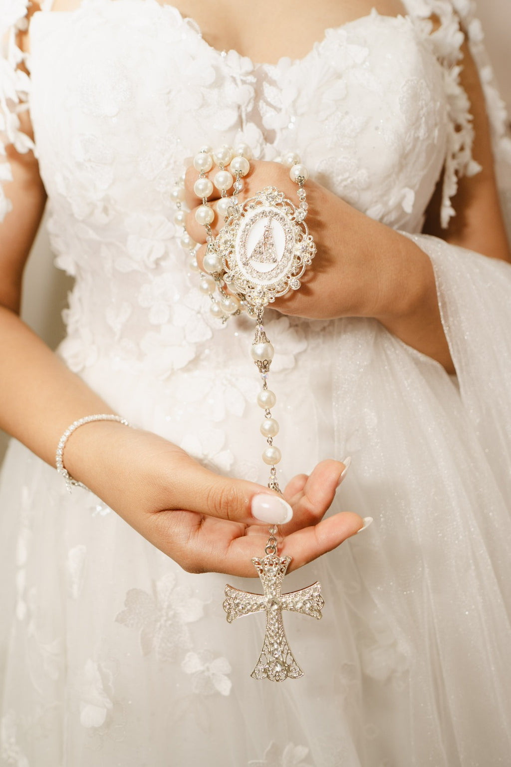 Um terço que não só completa o look da noiva, mas também carrega bênçãos para um novo capítulo repleto de amor.