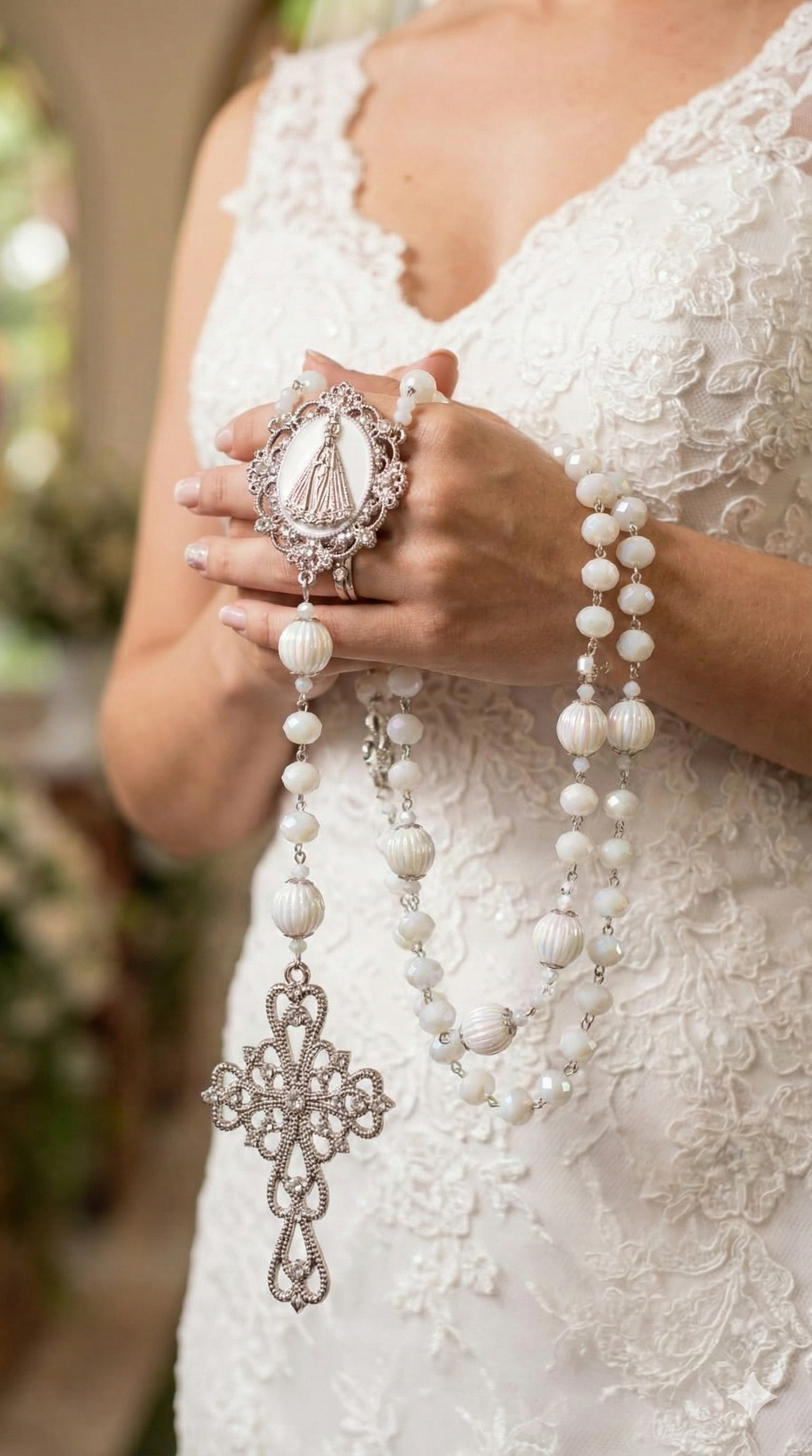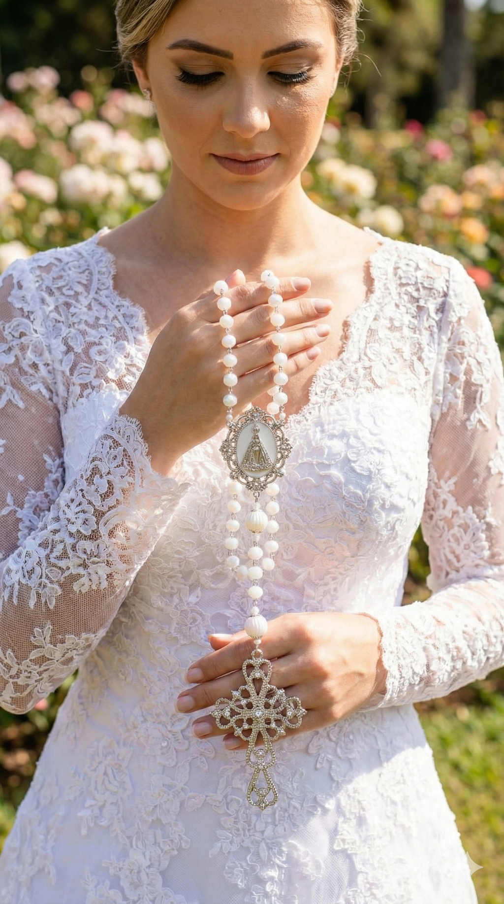 Um terço que não só completa o look da noiva, mas também carrega bênçãos para um novo capítulo repleto de amor.