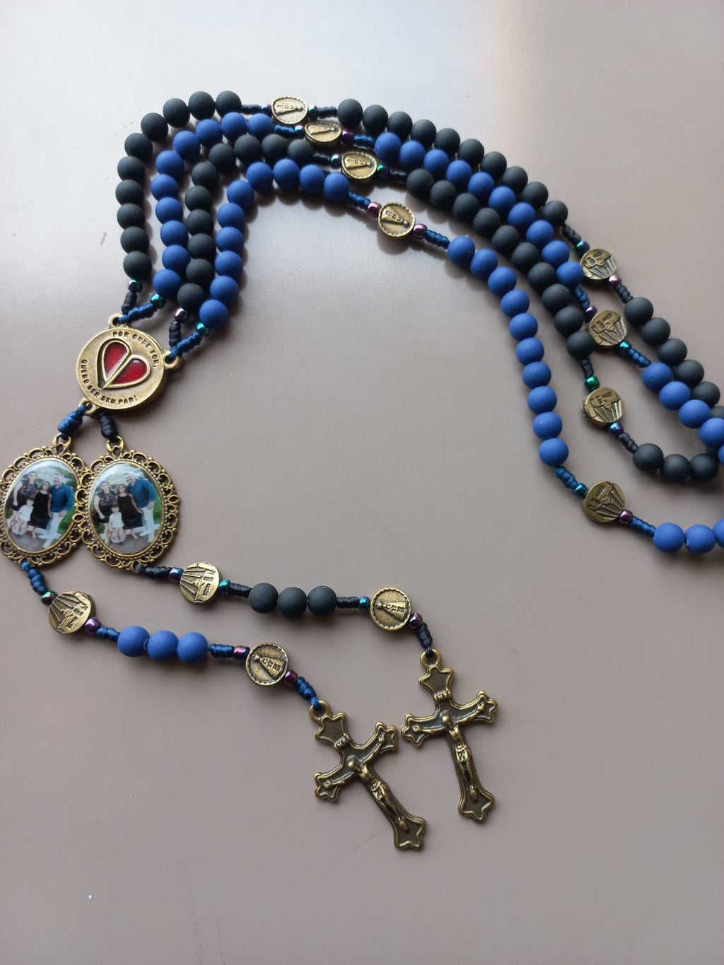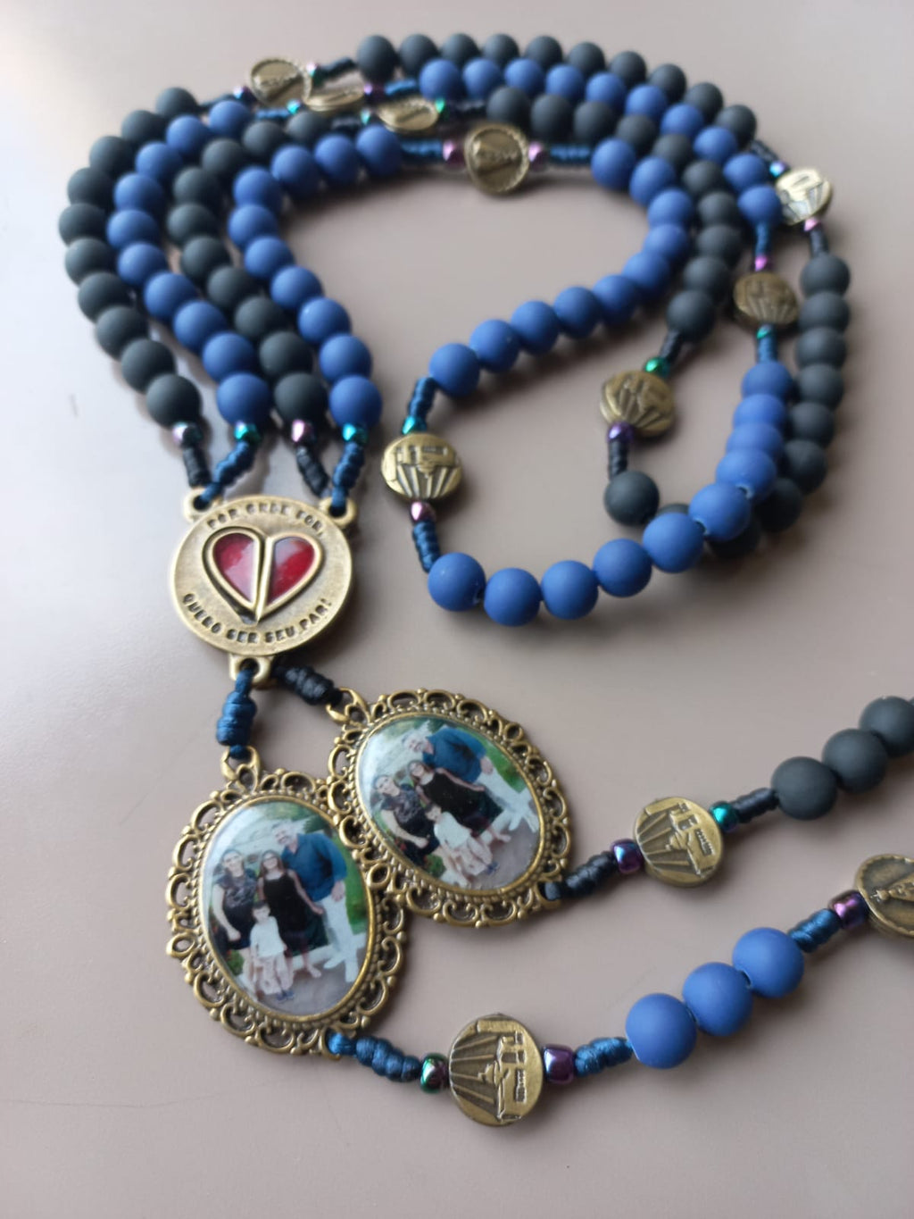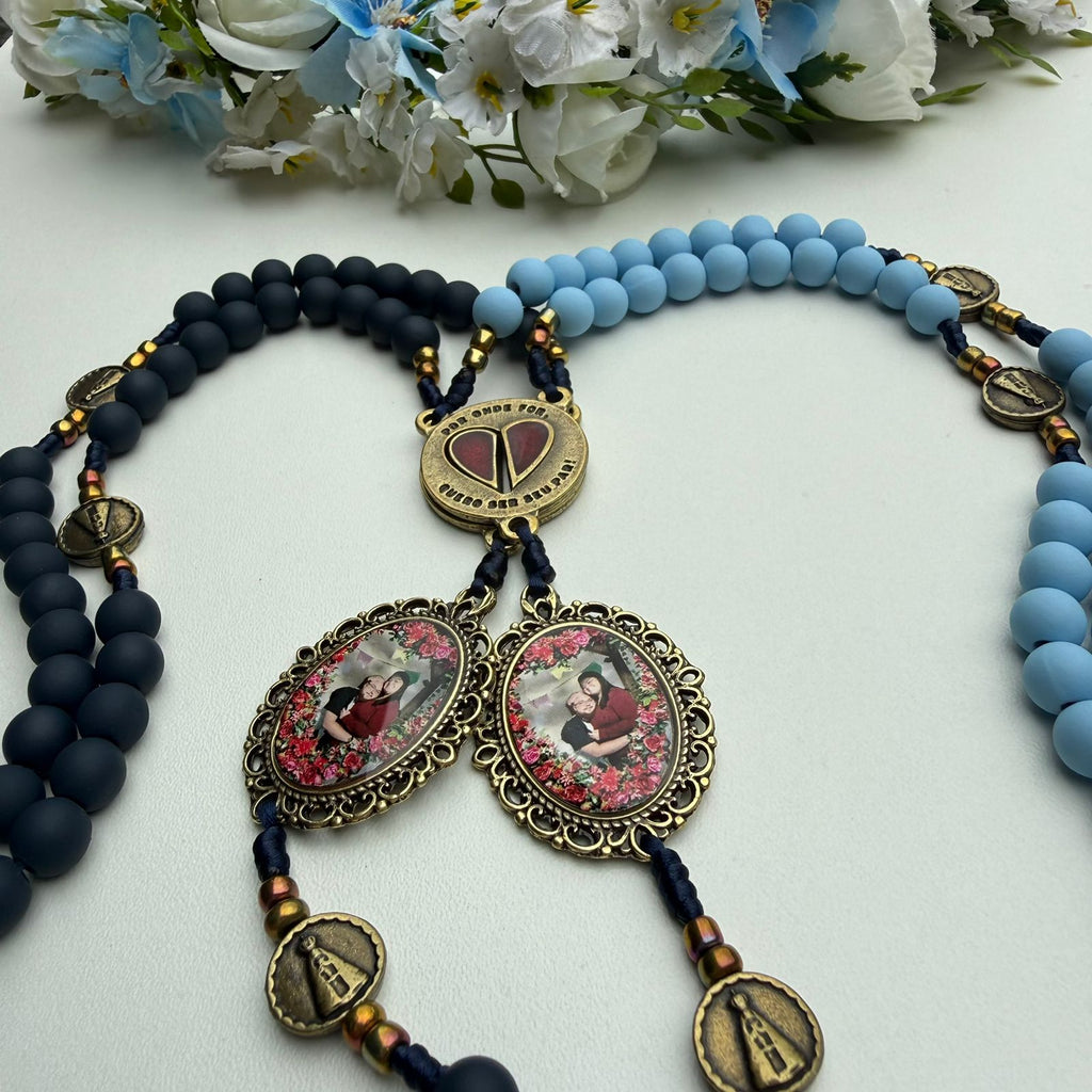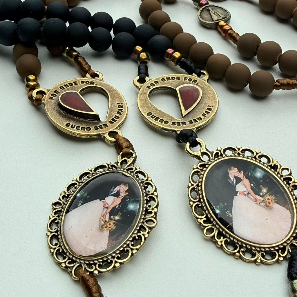 Cada terço é personalizado com a foto do casal , tornando a peça única, emocional e cheia de significado. O destaque fica para o entremeio em formato de coração , dividido em duas partes que se unem perfeitamente — simbolizando duas almas que caminham lado a lado, em sintonia, fé e amor.