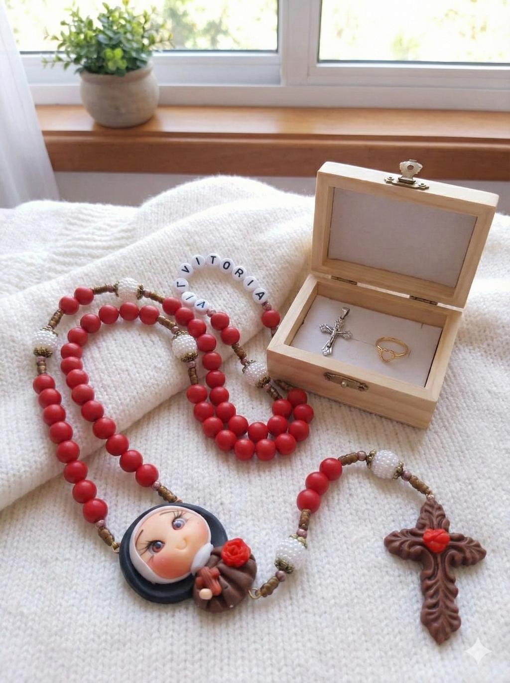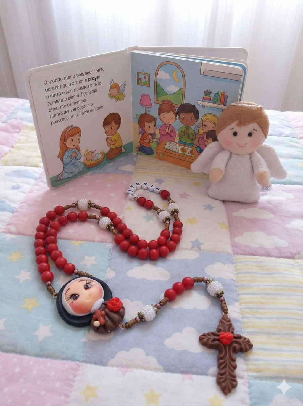 Um terço criado para aproximar o coração das crianças do amor de Deus, com suavidade, pureza e muita fé.